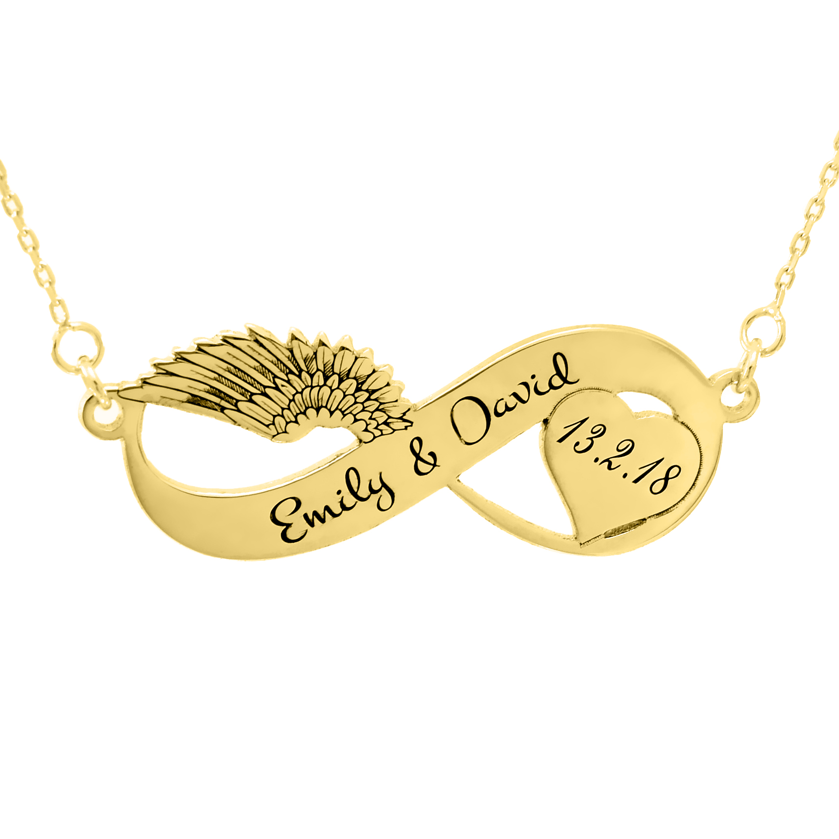 שרשרת עם תליון אינפיניטי כנפיים בשילוב שמות בני הזוג ותאריך החתונה או הפגישה