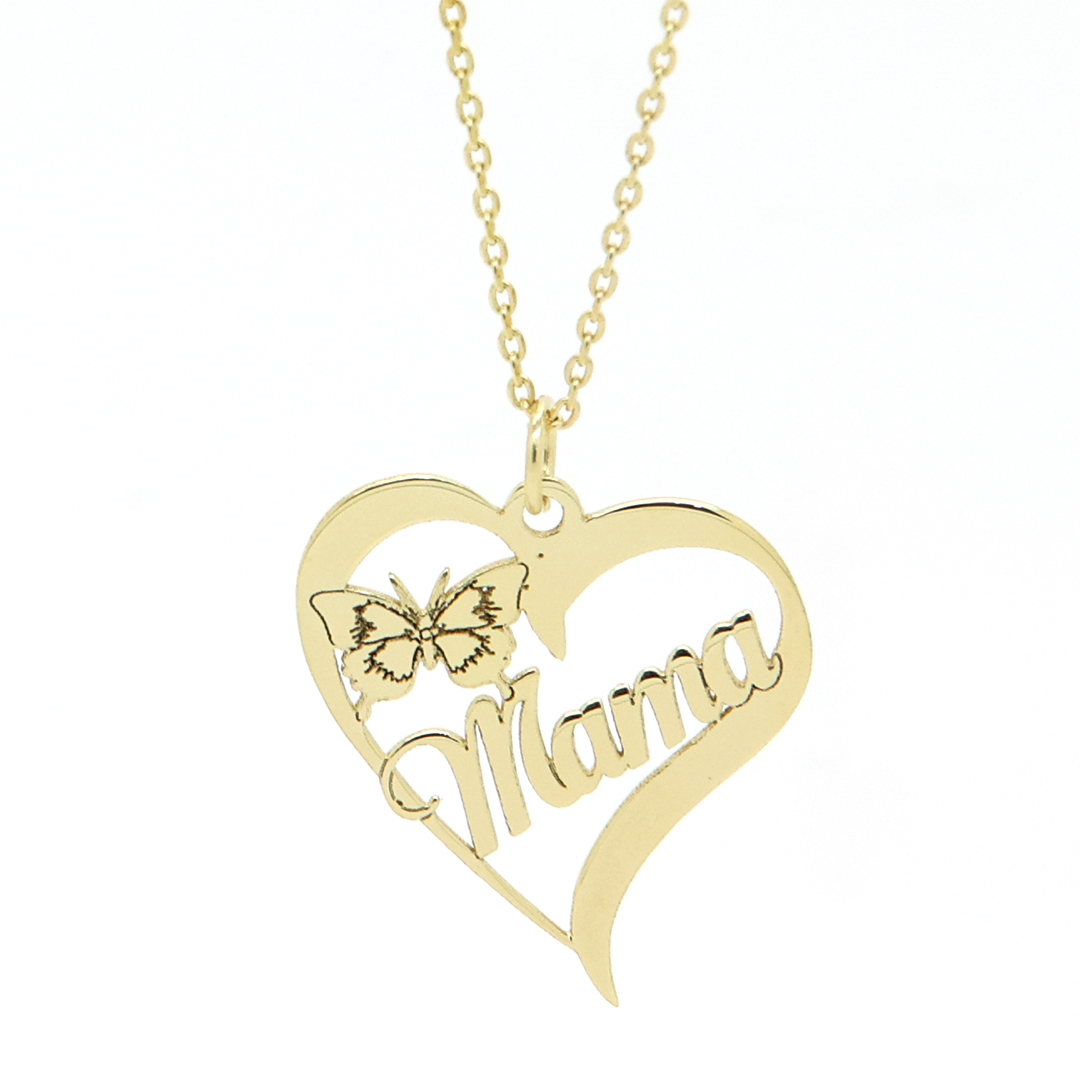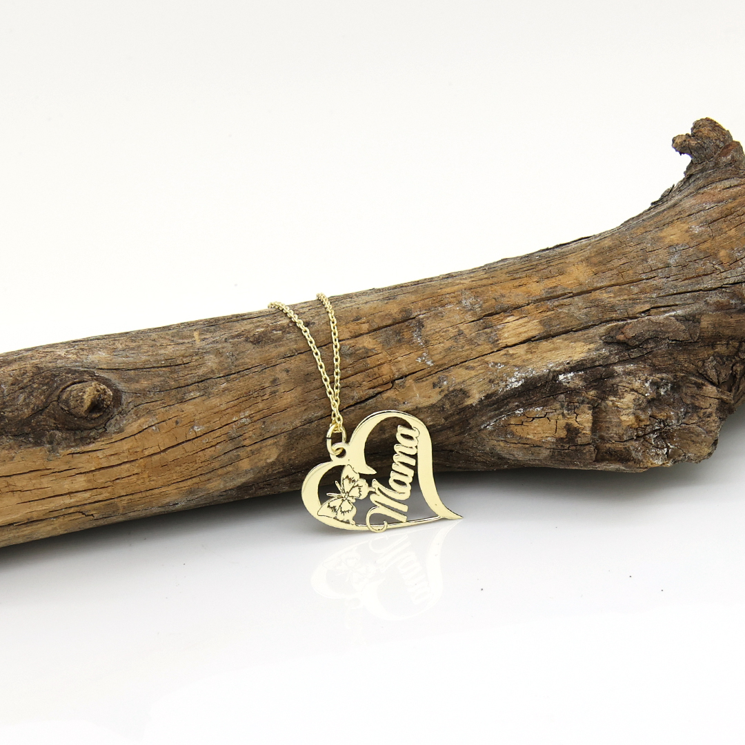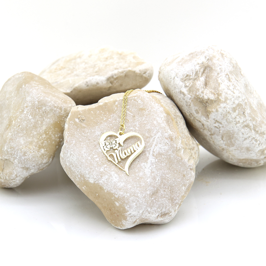 שרשרת לב עם חריטת פרפר ובמרכז הלב שם בכתב מיוחד.