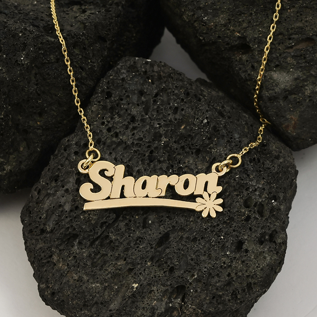 שרשרת שם עם קו עיצובי וחריטת פרח.