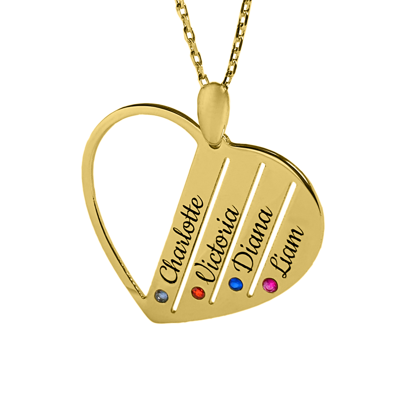 שרשרת לב נטוי בעיצוב מיוחד עם חריטת שמות בשיבוץ אבני לידה.